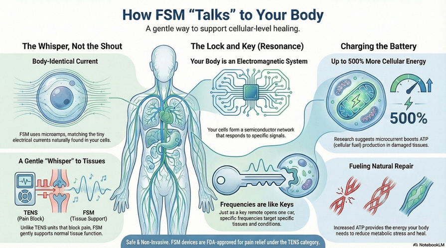 FSM uses microcurrents that mirror the body’s own electrical activity, supporting tissues through resonance—like a lock and key—so the body recognizes and responds to the signal.